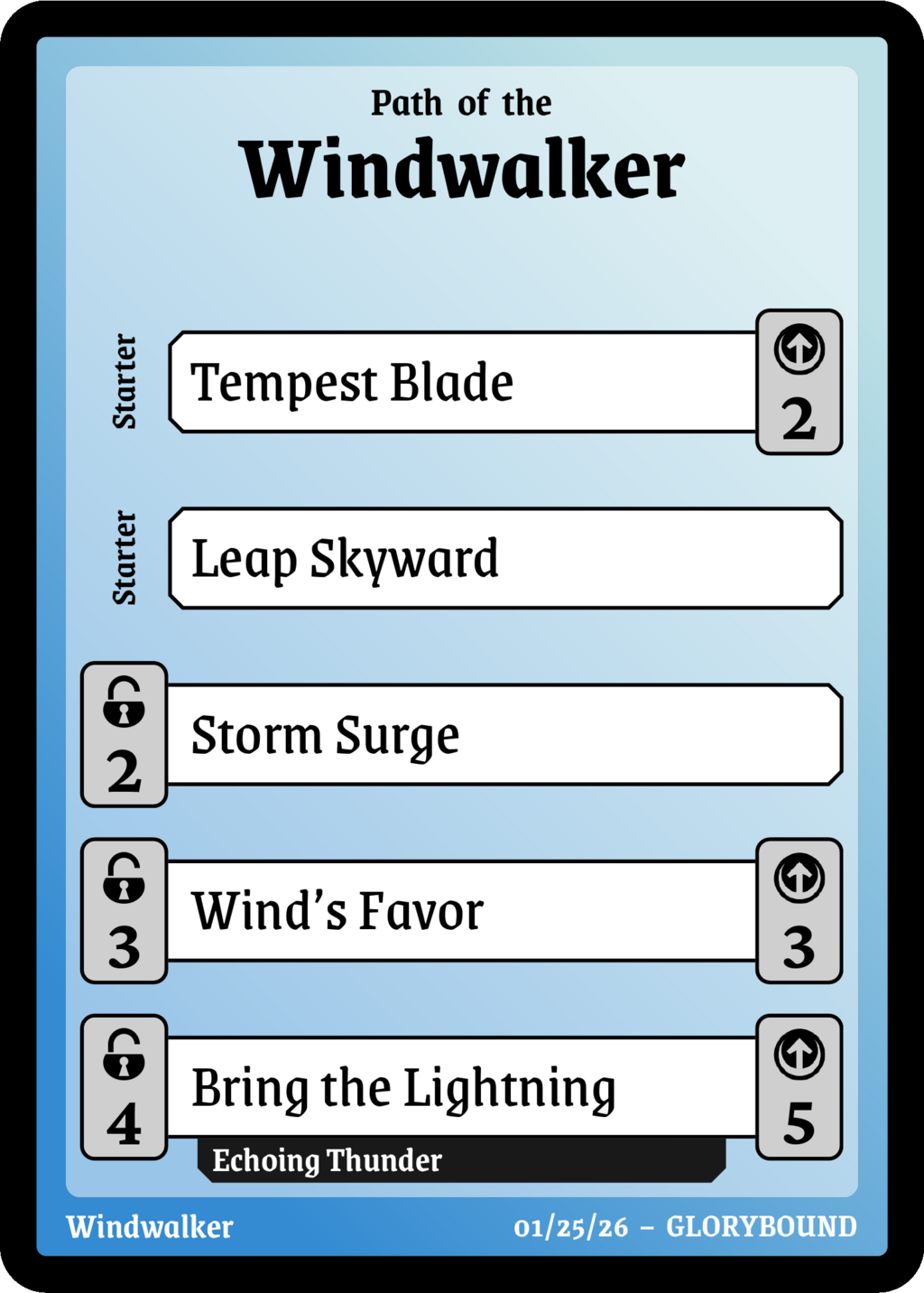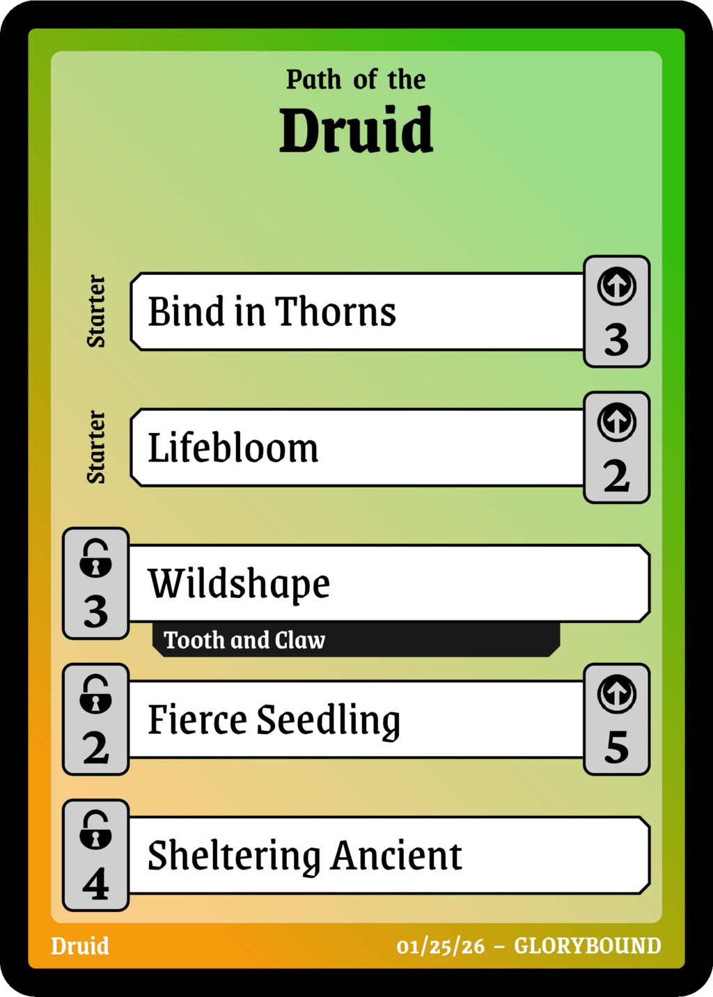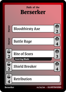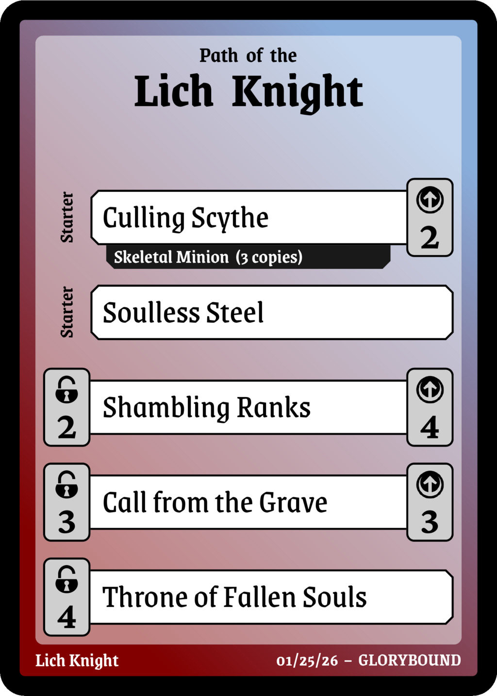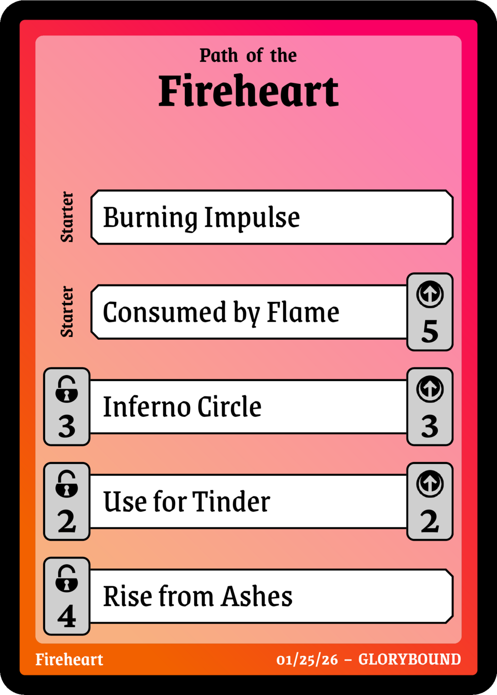 Glorybound is a tournament style deck builder based board game currently in Beta testing. At the start of the game, you'll choose and combine two Paths and one Heirloom. Then, you'll compete in one-on-one matches, unlocking and upgrading cards between fights, until one final player is left standing.