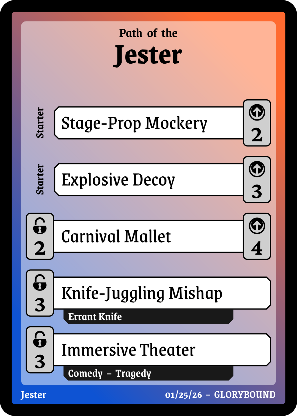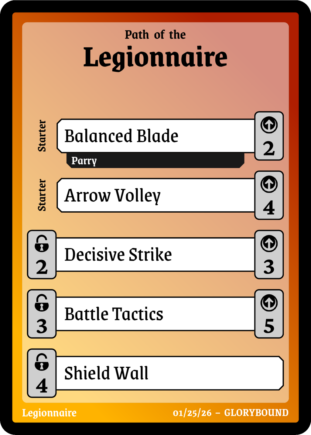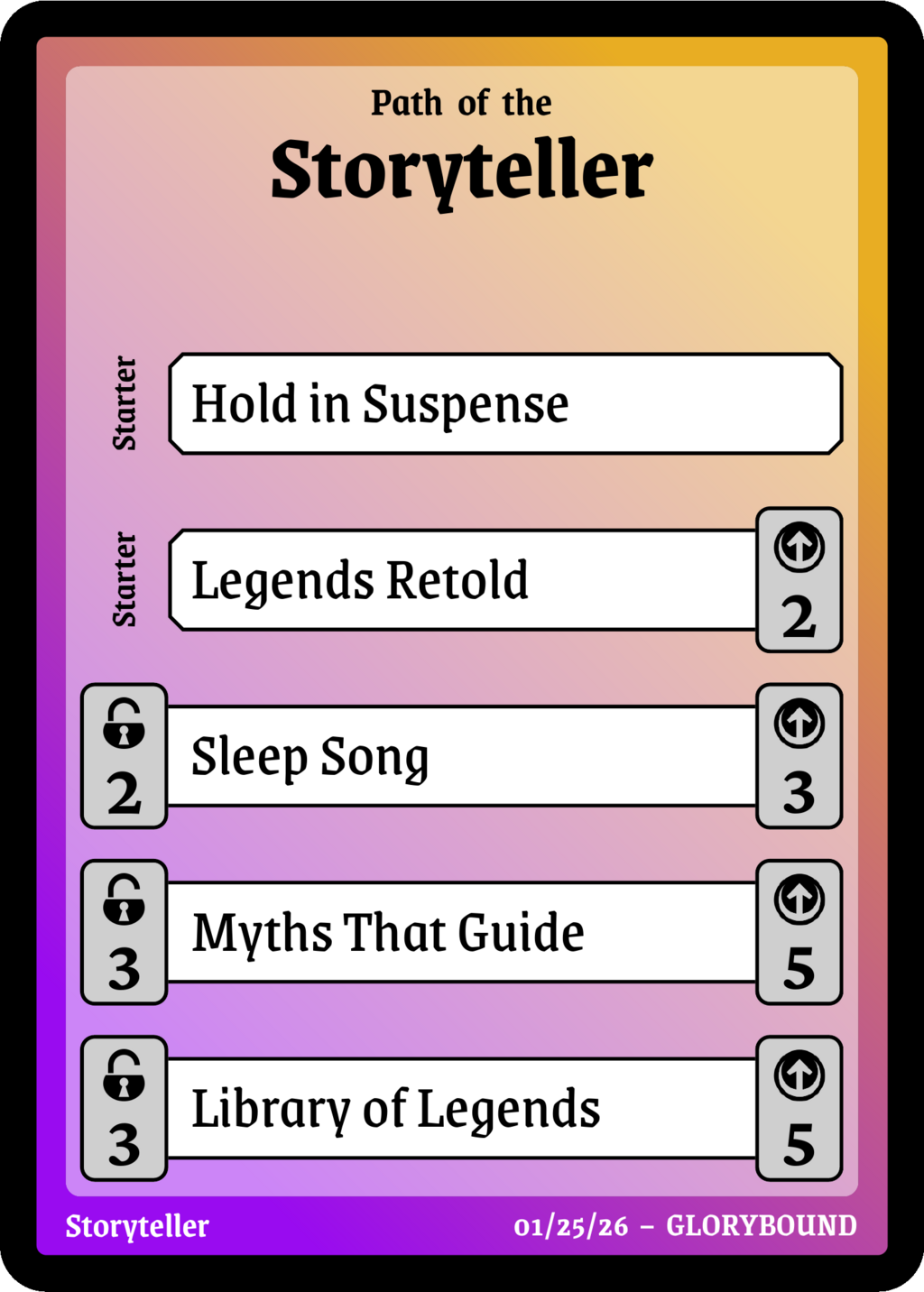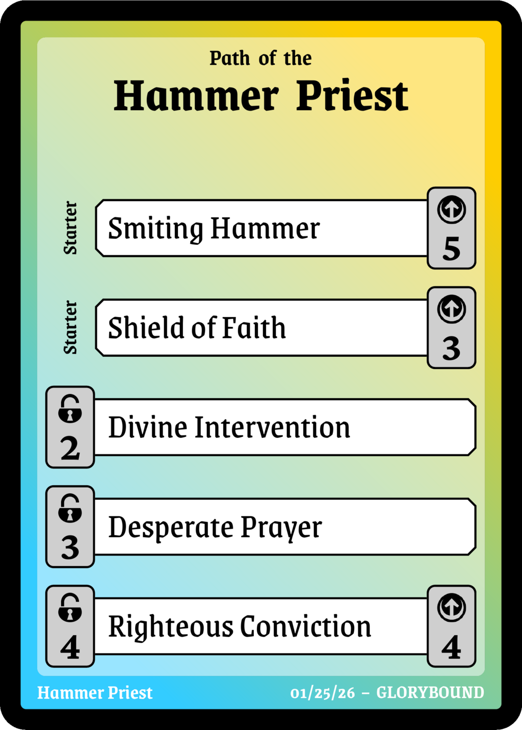 Glorybound is a tournament style deck builder based board game currently in Beta testing. At the start of the game, you'll choose and combine two Paths and one Heirloom. Then, you'll compete in one-on-one matches, unlocking and upgrading cards between fights, until one final player is left standing.