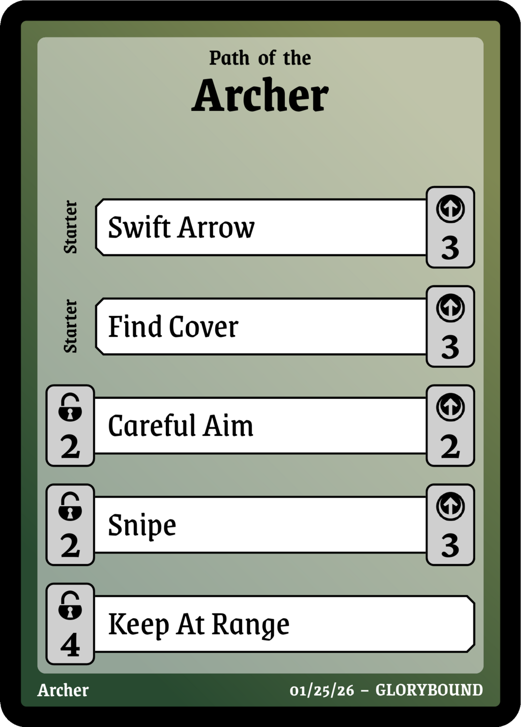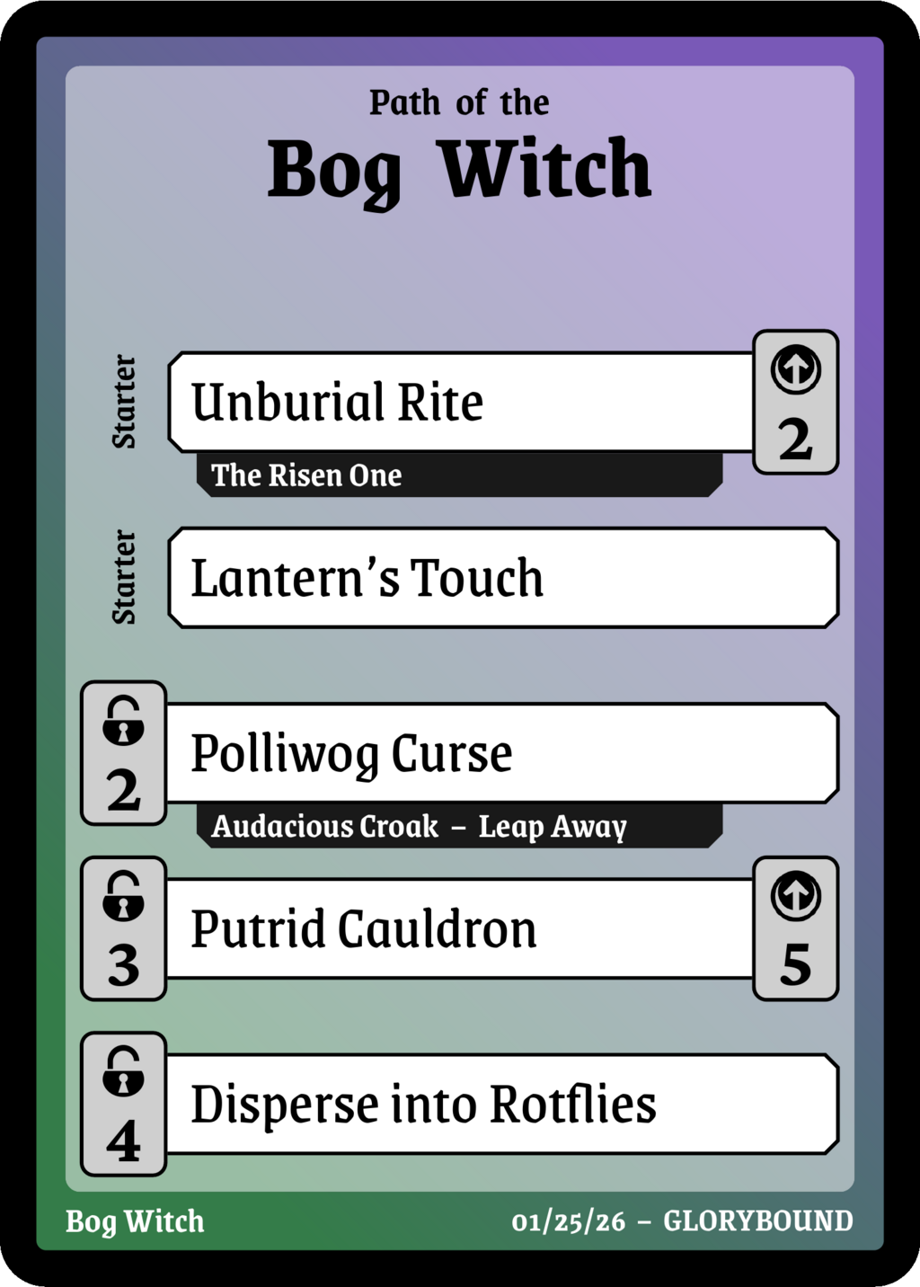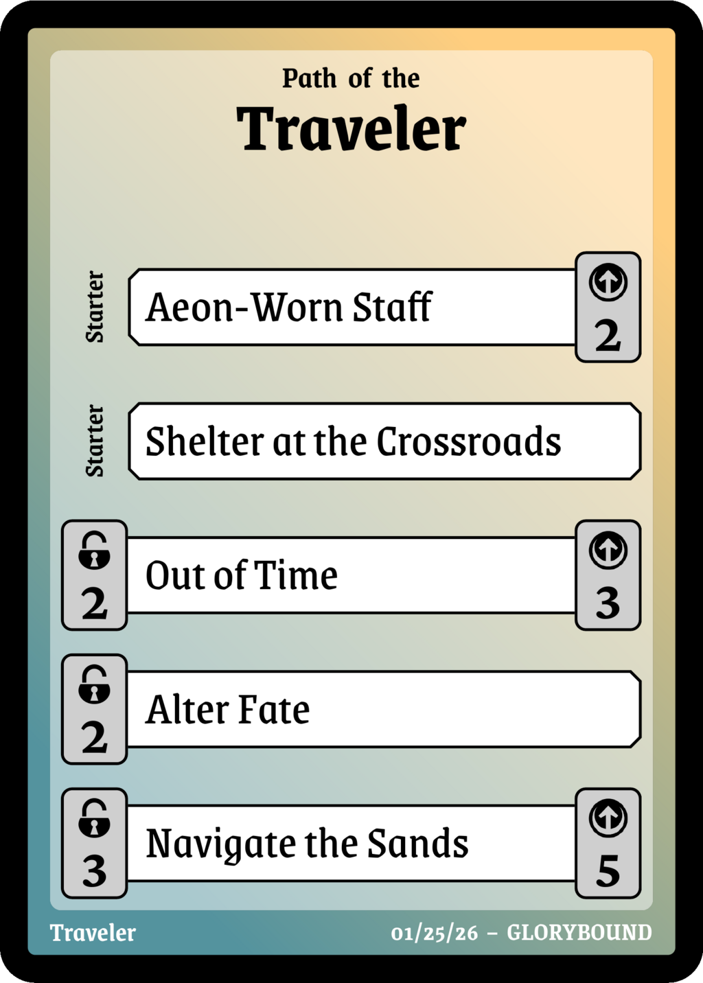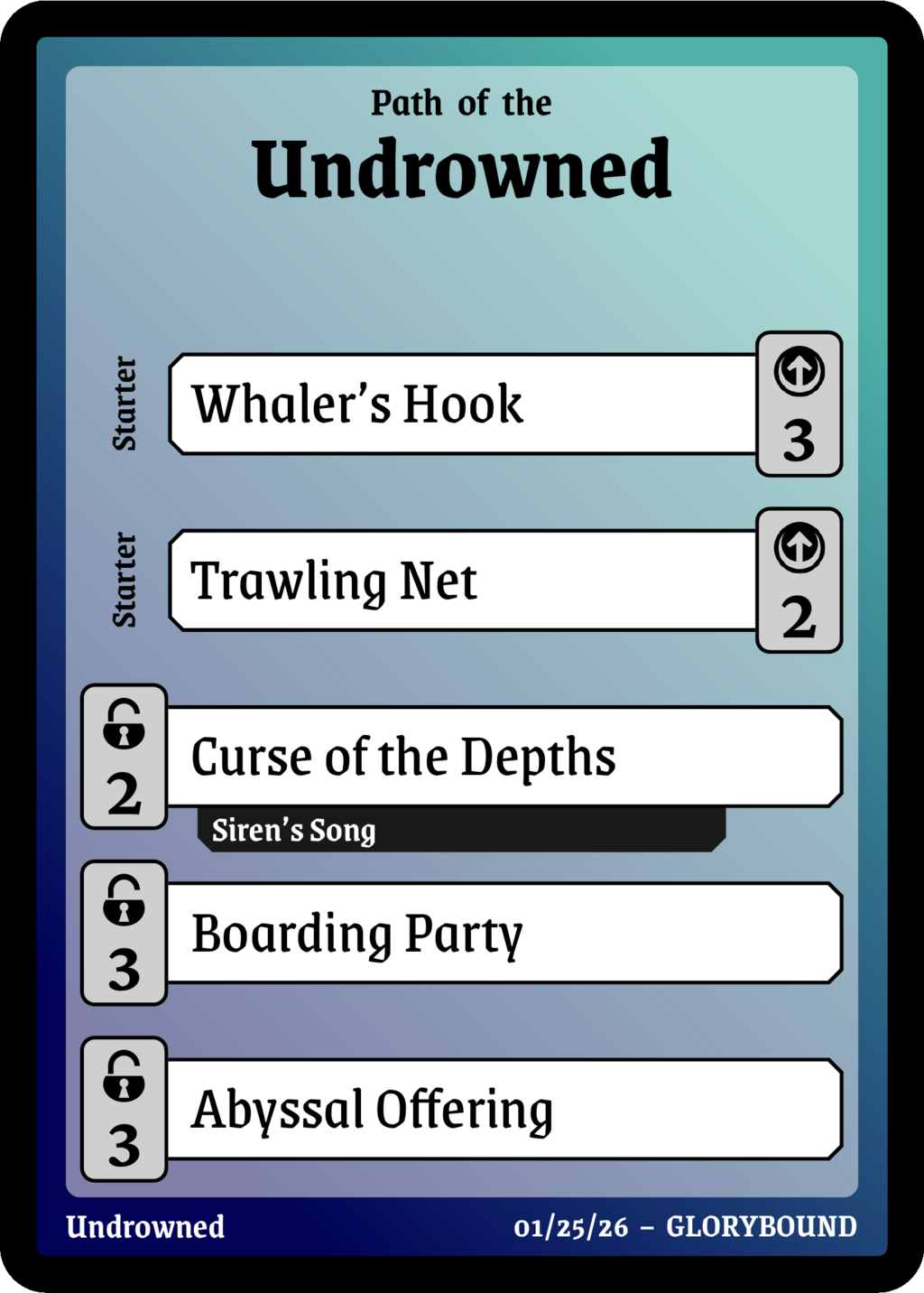 Glorybound is a tournament style deck builder based board game currently in Beta testing. At the start of the game, you'll choose and combine two Paths and one Heirloom. Then, you'll compete in one-on-one matches, unlocking and upgrading cards between fights, until one final player is left standing.