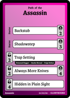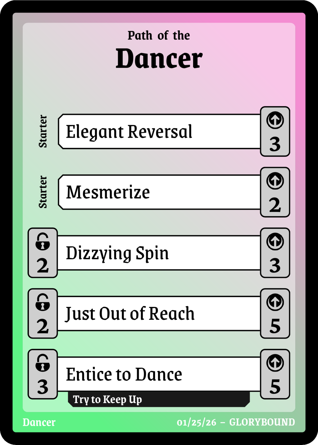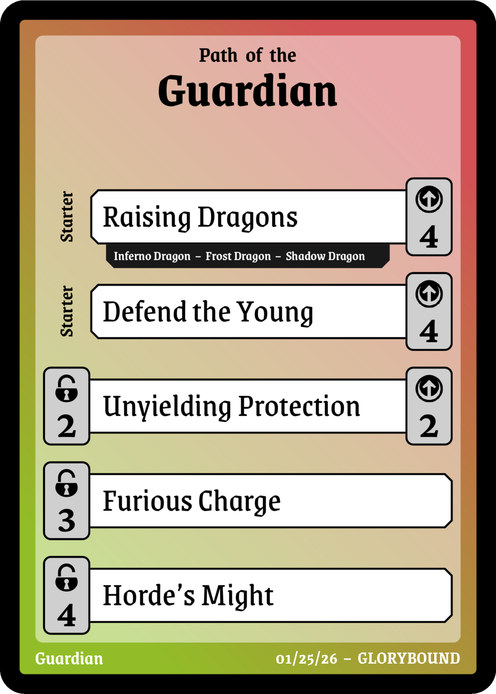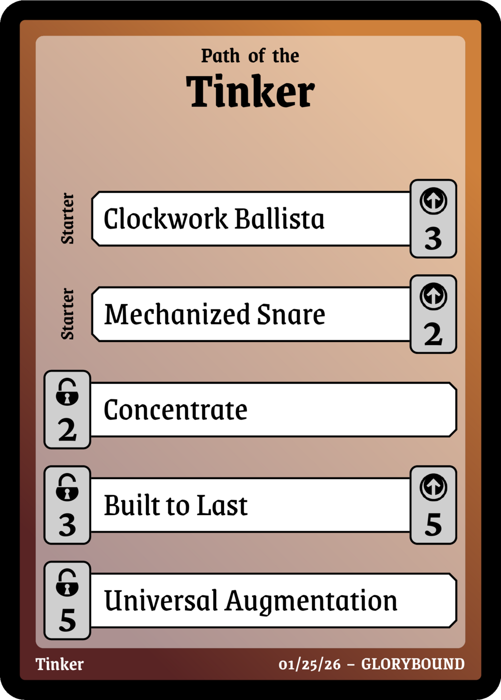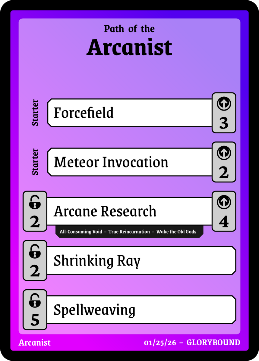 Glorybound is a tournament style deck builder based board game currently in Beta testing. At the start of the game, you'll choose and combine two Paths and one Heirloom. Then, you'll compete in one-on-one matches, unlocking and upgrading cards between fights, until one final player is left standing.